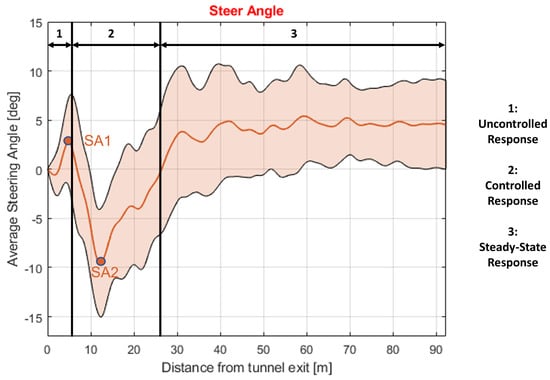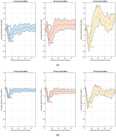 From Figure 9a and Figure 10a, it is clear that the general response is dominated by two opposite peaks in the transient that fade away as soon as steady-state wind conditions are reached (i.e., as the vehicle moves further away from the tunnel). More in detail, we can say that, at first, we observe an uncontrolled response of the driver. This uncontrolled response is connected to the delay experienced by the driver in perceiving the phenomenon. This delay causes the driver to apply practically no steering torque at the wheel in the initial phase of the maneuver. The lack of control by the driver is clearly highlighted in the first small peak, where the steer angle and yaw rate begin to increase due to the wind action alone. Then, the driver applies a proper control action that can be associated with the second peak in the opposite direction (negative).