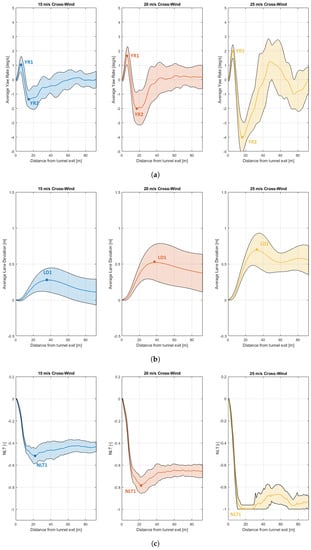 - as found by Chen et al. [23], the average delay of the “YR1” peak remains constant, even when changing crosswind intensity and vehicle velocity;