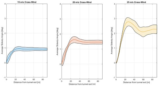 The aerodynamic loads developing at the tunnel exit induce a reaction by the vehicle–driver system. These loads are heavily influenced by the relative speed between the vehicle (in this case a high-sided lorry) and crosswind and by the angle of attack of the vehicle with respect to the wind flow. For the scenario considered (crosswind at tunnel exit), the aerodynamic lateral force and yaw moment can be considered as the most important factors causing the vehicle–driver response. The values of relative wind speed, angle of attack, aerodynamic lateral force , and aerodynamic yaw moment for the case of a fully exposed vehicle running at 65 km/h and 80 km/h are reported, respectively, in Table 5 and Table 6.