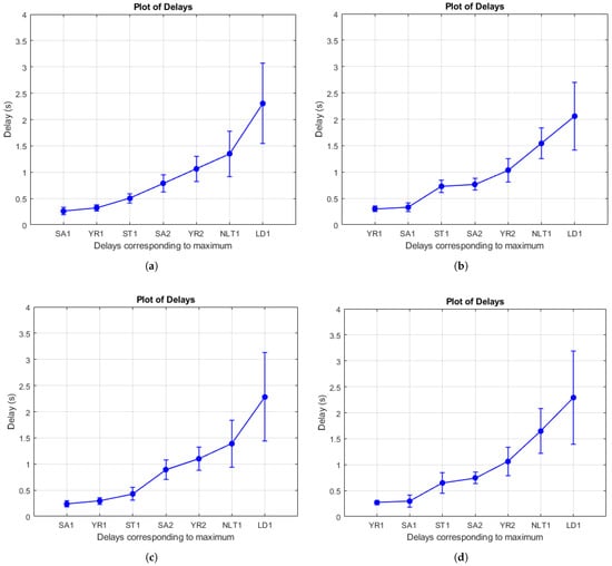 These delays (in particular “ST1” and “SA2”) are due to the action of the driver, as it is possible to see from Figure 9a,b. The driver’s action has to be summed up to the contribution of the vehicle dynamics that finally leads to the peaks “NLT1” and “LD1”. These two peaks are heavily influenced by the inertia (and payload level) of the lorry and by the intensity of the wind gust. In the cases analyzed, the roll motion happens first. The mean value of the normalized load transfer is related to the mean wind speed, while the oscillations are due to the driver’s action. At last, the maximum lateral deviation “LD1” (once again influenced by vehicle configuration and wind intensity) is reached.