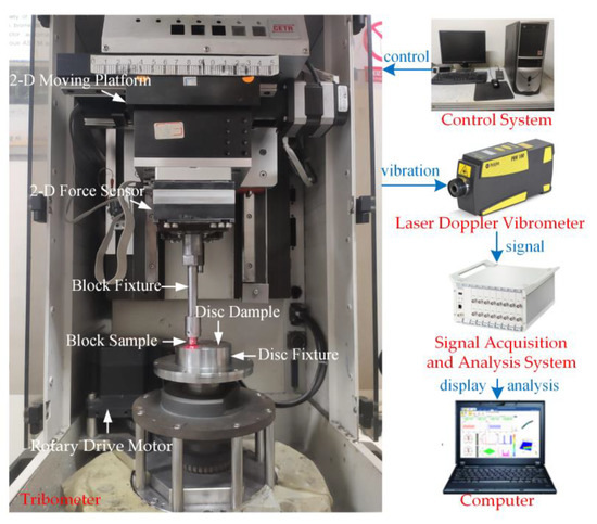 The experimental device mainly included a friction test system and a signal acquisition and analysis system, as shown in Figure 2. The friction test system consisted of a small-scale tribometer (CETR UMT-3) and a computer controller. The tribometer was mainly composed of a two-dimensional force sensor, a two-dimensional moving platform, two sample fixtures, and a rotary drive motor. The two-dimensional force sensor was integrated with the two-dimensional moving platform, and it was used to measure the normal force and tangential force of the disc–block friction interface. The upper end of the block fixture was bolted to the two-dimensional force sensor. The lower end of the block fixture fixed the friction block with bolts. The disc fixture was bolted to the rotary drive motor output device.