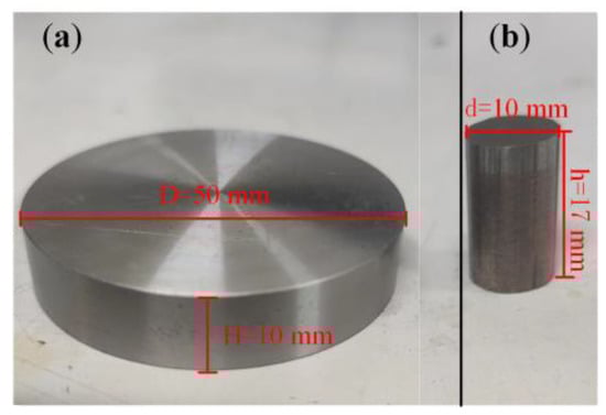 The experimental samples are shown in Figure 3. The disc test sample had a diameter of 50 mm and a thickness of 10 mm. Its material was the same as that of the brake disc for a high-speed train brake system. The chemical composition of the disc test sample is shown in Table 1. The cross-section of the brake pads commonly used in the high-speed train brake system had three shapes: circle, pentagon, and hexagon. Considering that the leading edges of the pentagon and hexagon noticeably affect the system vibration [19], the circle was selected as the cross-sectional shape of the friction block sample in the experiment. The friction block was cut from a brake pad of a high-speed train brake system whose diameter was 10 mm and height was 17 mm. The chemical composition of the block test sample is shown in Table 2. The material properties of the disc and block test samples are shown in Table 3.