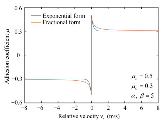 The Stribeck model, also known as the Stribeck effect, is mainly used to describe the friction behavior in a low-velocity range, where the coefficient of friction is defined as a function of relative velocity with a negative slope [37,38]. The expressions of the Stribeck model generally have two forms: exponential [39] and fractional types [40,41], as shown in Figure 4, and these two forms of the Stribeck model are adopted to characterize the negative friction–velocity slope of the disc–block friction system with different friction radii in experiments. The relationship between the friction coefficient and the relative velocity of the exponential-type Stribeck model is expressed as follows [39]: