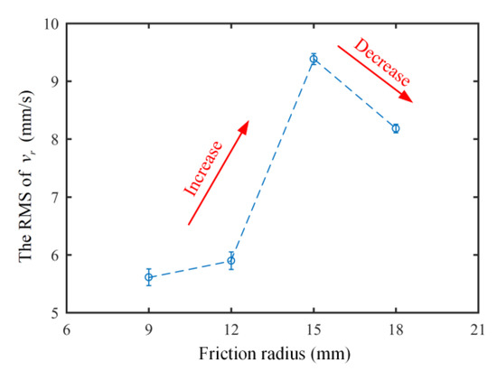 Figure 5 shows the root-mean-square values and the error bars of tangential velocity signals for the friction block in four groups of repeated tests under different friction radius conditions. Obviously, it was found that the error bars of the results under the four working conditions were all small, which indicates that the experiment had good repeatability and reliability. Thus, the experimental results could be further analyzed. Additionally, with the friction radius increases, the tangential velocity of the friction block first increased and then decreased. When the friction radius was 15 mm, the tangential velocity reached its maximum.