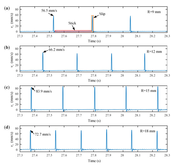 The rotational speed of the disc and friction radius were defined in the tests, and the tangential velocity of the block was measured by the vibrometer. Then, the disc–block relative velocity could be calculated according to Equation (4). Figure 6 shows the time-domain responses of disc–block relative velocity under four working conditions with friction radii of 9 mm, 12 mm, 15 mm, and 18 mm. Within one second, the numbers of stick–slip vibrations were 3, 4, 5, and 6, respectively, and the amplitudes of the disc–block relative velocities were 56.5 mm/s, 66.2 mm/s, 83.9 mm/s, and 72.7 mm/s, respectively. This indicates that with the increase in the friction radius, the period of stick–slip vibration decreased and the amplitude of stick–slip vibration increased first and then decreased. When the friction radius was 15 mm, the vibration intensity was the highest.