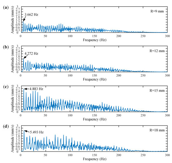 The frequency-domain responses of the disc–block relative velocity under these four friction radius conditions were further analyzed, as shown in Figure 7. The results show that the fundamental frequencies of the system were 3.662 Hz, 4.272 Hz, 4.883 Hz, and 5.493 Hz, respectively, which illustrates that the stick–slip vibration frequency increased with the increase in the friction radius. The energy amplitudes at the fundamental frequencies were 1.284, 1.526, 2.640, and 2.432, which also indicates that the intensity of stick–slip vibration increased first and then decreased with the increase in the friction radius.