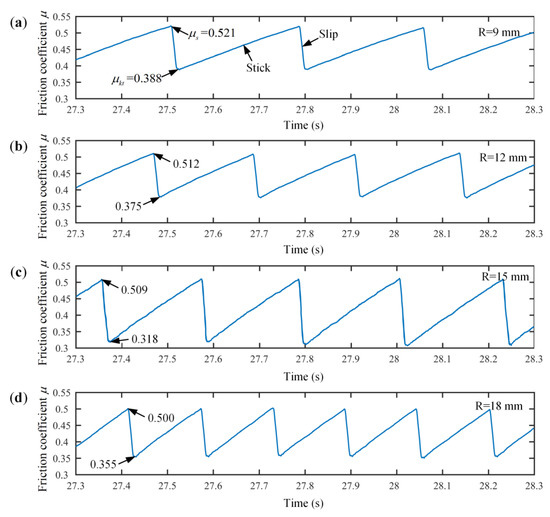 The variation trends of the dynamic and static friction coefficients at the friction radii of (a) 9 mm, (b) 12 mm, (c) 15 mm, and (d) 18 mm were further analyzed, as shown in Figure 9. The results display that with the increase in the friction radius the static friction coefficient always decreased, while the dynamic friction coefficient decreased first and then increased. The differences between the dynamic and static friction coefficients were 0.131, 0.137, 0.191, and 0.144 at the friction radii of 9 mm, 12 mm, 15 mm, and 18 mm, respectively. The amplitude of the stick–slip vibration was positively related to the difference between the dynamic and static friction coefficients. With the friction radius increases, the difference increased first and then decreased. When the friction radius was 15 mm, the difference reached its maximum. Therefore, the variation trend of the RMS of the tangential velocity in Figure 5 was consistent with that of the differences between the dynamic and static friction coefficients in Figure 9.