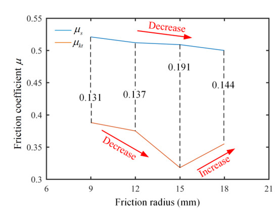 - With the increase in the friction radius, the static friction coefficient decreased gradually and the dynamic friction coefficient decreased first and then increased. Furthermore, the variation trend of the difference between the dynamic and static friction coefficients was consistent with that of the stick–slip vibration amplitude.