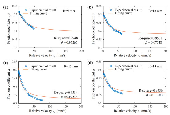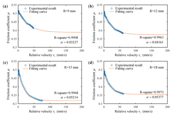 Experimental results and fitting curves of the exponential Stribeck model at different friction radii: (a) 9 mm, (b) 12 mm, (c) 15 mm, (d) 18 mm.