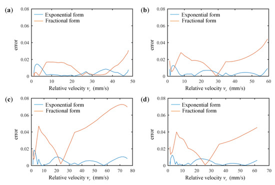Relative errors of the exponential and fractional forms of the Stribeck model at different friction radii: (a) 9 mm, (b) 12 mm, (c) 15 mm, (d) 18 mm.