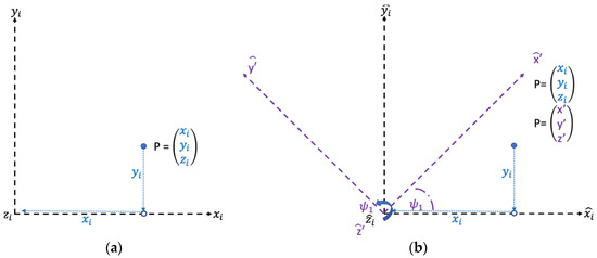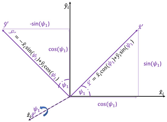 The following direction cosine matrix creation uses the proposed method. Using the 3, 2, and 1 order of rotations, or the 3-, 2-, 1-direction cosine matrix, will take the inertial frame to a body frame. In this description, the order of the rotation also follows the number order. However, it is essential to note that any combination of rotations or translation types can be performed similarly. While the order does not matter, the 3-rotation is the easiest to conceptualize, because a horizontal -axis and a vertical -axis is the most common representation and makes for a solid foundation. First, any point P with coordinates (xi, yi, zi) is placed in the inertial space with axes (, , ), as seen in Figure 7a. Next, a rotation about is rotated by ψ1 to , as seen in Figure 7b. In Figure 7b, point P has different coordinates after the rotation to the new frame of reference. The difference between the coordinates can be calculated using simple equations. Table 2 outlines all the variables found in Figure 7, Figure 8, Figure 9, Figure 10, Figure 11 and Figure 12.