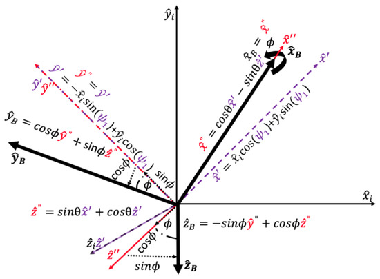 Finally, the 1-rotation in Figure 17 is developed in the same manner as the 3-rotation and 2-rotation. The x″ axis is rotated by to thereby providing the final conversion from (x″, y″, z″) to (,,) coordinates; this provides Equations (28)–(37). Table 5 outlines all the variables found in Figure 17.