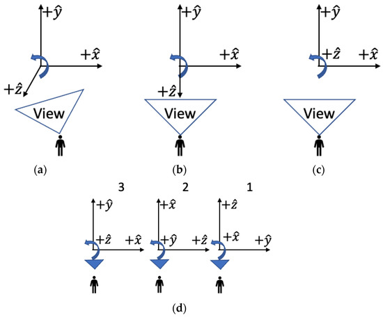 This manuscript uses the 2DRV to help depict and write the translation equations. The 2DRV takes advantage of the fact that a reference frame can be viewed from any aspect. Specifically, 2DRV takes a three-dimensional view and changes the perspective, so only two dimensions are visible. Figure 6a–d depicts the change in perspective. It is important to note that the positive axis being rotated about will face directly out of the page, and the perpendicular positive axes will point up and to the right consistent with a right-hand revolution.