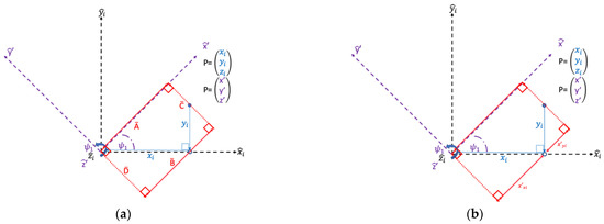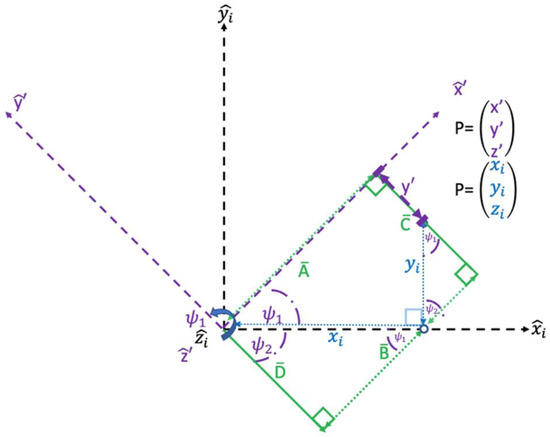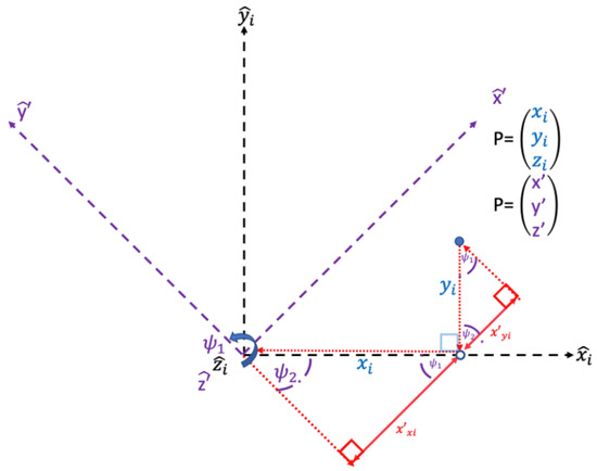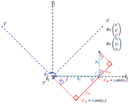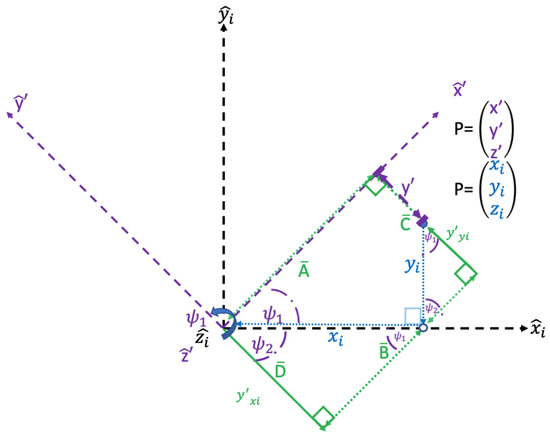 By segmenting line into y′ and , one can take the difference of line or and a segment of to calculate y′;. The segments are labeled by the dimension (xi or y) of the initial orientation axis, results in the and as seen in Figure 14. Labeling the pertinent sides of two triangles and in Figure 14, one can use a similar equation to Equation (8) to calculate y′;, and obtain Equation (12).