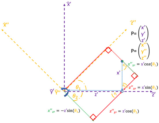 Continuing to the 2-rotation in Figure 16, the axis is rotated by θ1 to . Figure 6d shows the view of the rotation is changed so that the positive axis of the rotating axis ( and ) is viewed as coming directly out of the page. Point P is now taken from (x′;,y′;,z′;) to (x″,y″,z″), similar to Figure 12 and Figure 15. Then, similar equations can be developed using the same mathematics Equations (18)–(27). Table 4 outlines all the variables found in Figure 16.