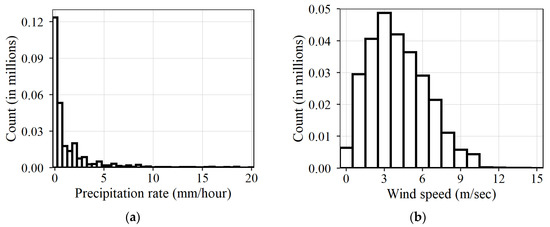 Histogram plot for key continuous parameters. (a) Histogram of precipitation rate (b) Histogram of wind speed (c) Histogram of temperature (d) Histogram of visibility.