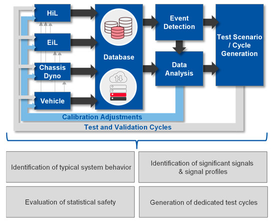 All test environments are used to acquire measurement data. Data analysis by means of event detection and statistical evaluation then refers to the entire database content. The use of the common database enables the continuous use of data from the early phases, focusing on test benches, to the final phases in the vehicle. In addition to, e.g., emission tests or simulations, measurements of daily driving operation (robustness measurements), which represent the real usage behavior of the system, are also stored.
