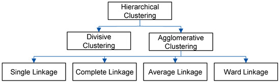 Hierarchical clustering is often used for the categorization of time-based data. Empirical analyses show that the results of this methodology are usually of high quality [52,53,54,55]. One of the main advantages is the lack of a need for parameters to create the clusters. Furthermore, a complete cluster structure is created by the algorithm. The resulting hierarchy provides initial information about the dataset. For hierarchical cluster methodologies, there are different approaches to create the clusters. Figure 3 shows an overview of different approaches for hierarchical clustering.