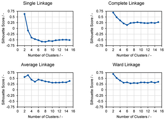 Single Linkage and Complete Linkage use only one element of each cluster to calculate the distance between two clusters. In contrast, Average Linkage and Ward Linkage use all the elements within the two clusters. To create hierarchical clusters, the distance of the events must be known as a stopping rule. In this case, the distance and the number of useful clusters is unknown. For this reason, the Silhouette Score for to clusters is calculated to experimentally investigate an appropriate distance for the emission events. Similar results were observed on further analyses with different signals and events. The results—expressed by the Silhouette Score—are shown in Figure 4.