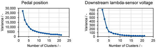 The variance of the cluster content is considered with increasing numbers of clusters, as shown in Figure 5. Using only one cluster results in the highest variance, as all datapoints are included. In opposition to this, the variance is if the number of events equals the number of clusters as each cluster only contains one specific signal trace. The Elbow Rule defines the optimum number of clusters by rating the resulting trace with respect to a change in the gradient. In front of the bending point, the variance strongly decreases, meaning that the clusters are becoming more compact. Beyond this point, the variance in the clusters decreases only slightly, meaning that the compactness of the clusters is only slightly optimized [56,57]. Figure 5 shows the results for cluster analyses with two different signals based on emission events. The comparison of the plots of the accelerator pedal position (left) and the voltage of the downstream lambda sensor (right) shows the difficulties in clearly identifying the results according to the Elbow Rule. The right profile shows an obvious bending point at clusters. The left profile shows a smoother trace and does not allow for the clear identification of the point of the optimal number of clusters. Since the bending point is not pronounced enough for some profiles, determining the ideal point using the Elbow Rule is not always possible.