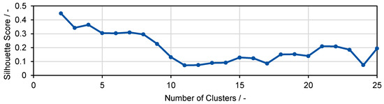 As a standard criterion for the evaluation of cluster results, the Silhouette Score is used for an iterative determination of the number of clusters. The optimal partitioning is determined by evaluating the cluster results for different cluster numbers and selecting the highest Silhouette Score result. The optimal partitioning is not always achieved at the absolute maximum value of the Silhouette Score. Cluster numbers that do not show the maximum in the trace of the Silhouette Score can provide better results than numbers that show a maximum Silhouette Score. The Silhouette Score for different target cluster numbers is shown in Figure 10, using the engine torque signal as reference.