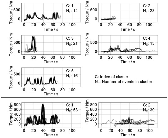 In the context of investigating different clustering approaches, hierarchical, partitioning, and density-based clustering methods are evaluated. Fourier-transformation-based methods [49,50,51] previously showed inadequate results due to the often small number of data points within a single event. For usability in the calibration process, clustering results are evaluated in terms of compactness and differentiability, as well as the required prior knowledge of the data. During the investigation, different signals are used as a reference for the calculation of event-to-event distances and thus the clustering itself. This methodology shall be applicable on all kinds of signals to identify significant event groups based on any signal. Later, investigations shall be carried out to identify the characteristic features of a dataset or cluster and will be published in a separate paper. Here, each set of clusters is based on the comparison of a single signal.