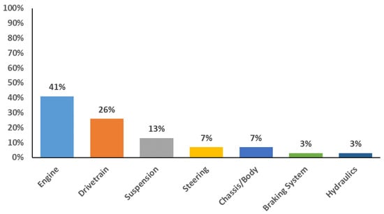 Distribution of component failures in automotive vehicles. The pie chart shows the percentage portion of failures of the different components: Engine (41%), Drivetrain (26%), Suspension (13%), Steering (7%), Chassis/Body (7%), Braking System (3%), Hydraulics (3%). Data were taken from: [].