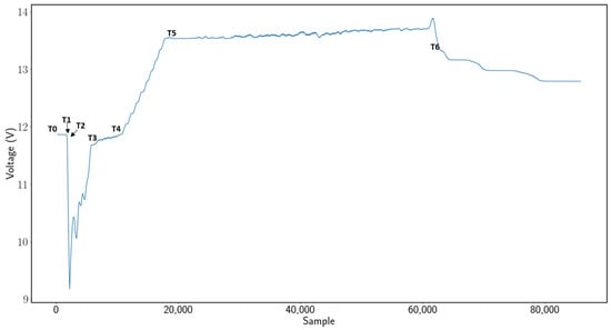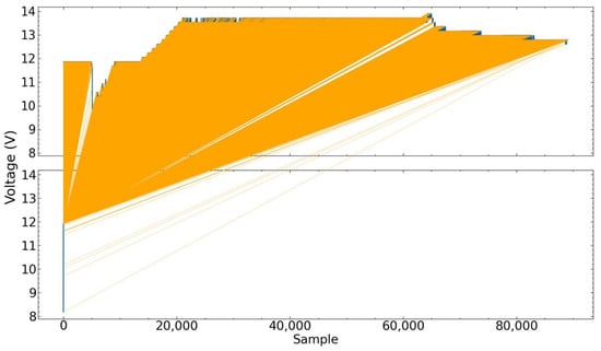The procedure for overlaying data at a prominent point involves several steps. The first step was to convert the CSV file into a data frame. This was done by a self-written Python script (script available at: https://gitlab.thga.de/PROLAB/paper_battery_voltage_analysis_ecuxosci, accessed on 2 February 2023). A data frame is a tabular representation of data organized in columns and rows. This makes it easier to analyse and manipulate the data. The next step was to find the minimum of the data. The minimum is the lowest value in a particular column or row. It was used to determine the split point. The split point is the point at which the data are split to be placed on top of each other. To calculate the split point, the point of the detected minimum was subtracted with the time range. The time range is the range in which the data were recorded. This indicates the exact time when the minimum occurred. After the split point was calculated, the transformed data frame was created. A transformed data frame is a modified version of the original data frame. In this case, the data were split at the calculated split point and superimposed. Finally, the transformed data frame was drawn. This allowed a visual comparison and analysis of the data. Figure 5 shows the transformed data.