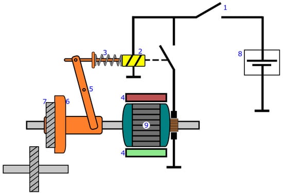 Schematic depiction of a starter. 1: Ignition switch, 2: Engagement relays, 3: Return spring, 4: Permanent magnet, 5: Engagement lever, 6: Roller free-wheel, 7: Pinion, 8: Car battery, 9: Anchor. Figure adapted from: [].
