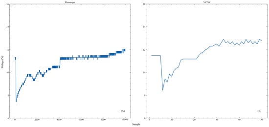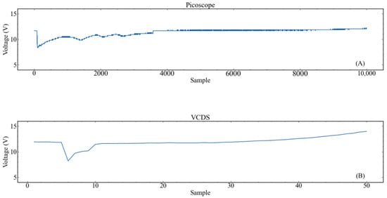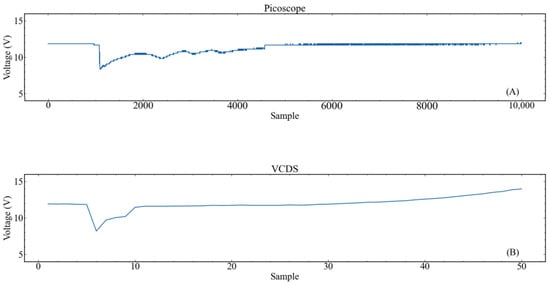 Comparison of the battery voltage curves from Picoscope (A) and VCDS (B).