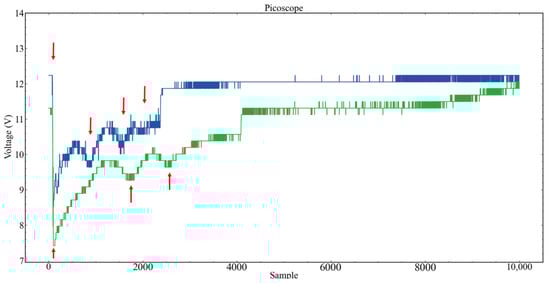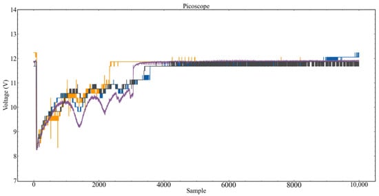 The battery voltage of a car can indicate possible engine failures as the course of the voltage during the starting process displays the engine’s compression []. The measurement of the battery voltage is simple and it can be performed without disassembly or any special measuring clamps or connectors. Thus, we focused on the accuracy of measuring battery voltage during cranking with an oscilloscope compared to the battery voltage measurement via the engine control units to compare both detection methods and identify their respective limitations and advantages.