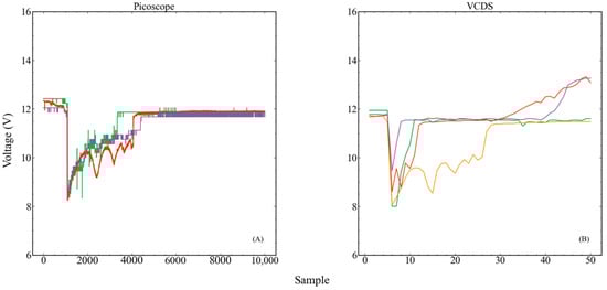 Normalized data of battery voltage from the Picoscope (A) and VCDS (B).