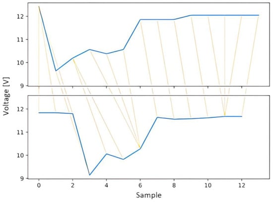 Offset of the graphs of the Picoscope (top) and VCDS (bottom), which was determined by DTW. The signals of the down-sampled data for Sample Five are shown. Blue represents the voltage signal of both detection methods and the yellow lines show the connectors based on the warping path.
