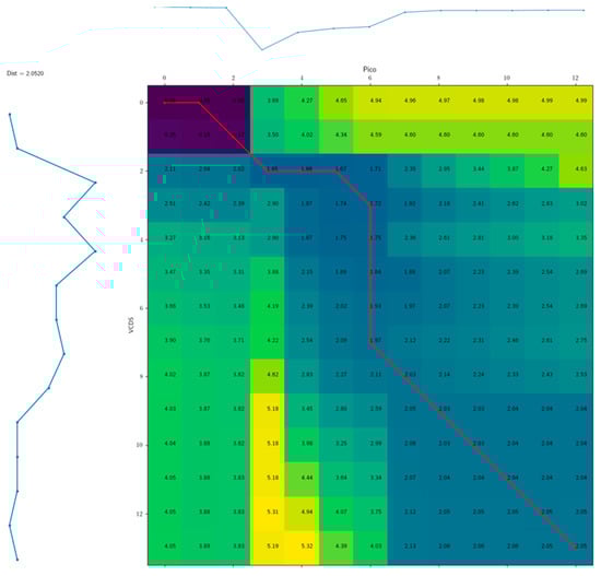 A heat map represents the cost of the possible time shifts from signal A to signal B. Figure 10 shows the heat map of the cost function that was used to determine the best possible alignment of signals A and B. To achieve this alignment, the path through the heat map needs to be minimized.
