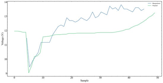 The original plot shows the four voltage drops, which were described as significant in Section 3.2. Manipulating the vehicle by removing the ignition coil resulted in a reduced number of voltage drops (3).