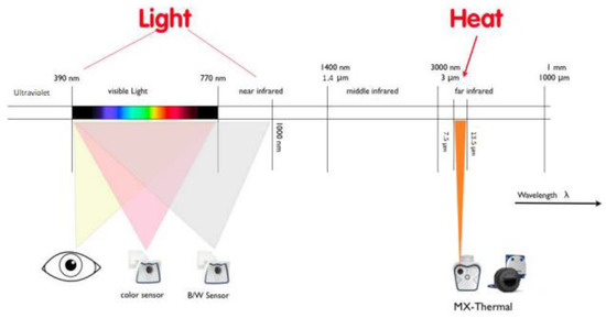 Thermal camera systems are a technology that makes it possible to see thermal radiation from objects that cannot be seen with the human eye (Figure 1). Thermal radiation is the energy transmitted by an object through its temperature and the wavelengths emitted by the electromagnetic spectrum. This technique is the result of accelerated charges emitting radiation in accordance with the laws of electrodynamics. Thermal cameras generally show heat density information in the range specified on the color scale (red = warm, blue = cold) [18].