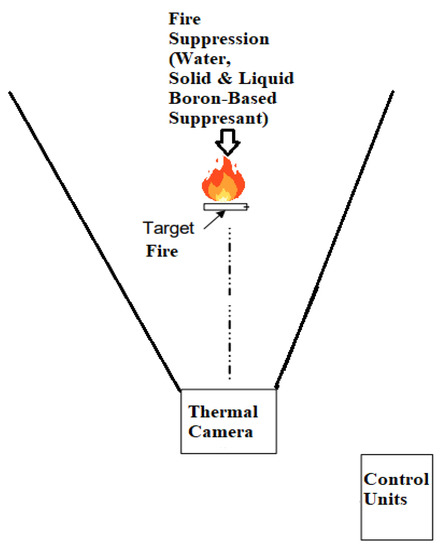 As can be seen in Figure 4, the distance between the fire environment and the thermal camera is 15 m. The thermal camera is located at a height of 3 m. The experiment was carried out at ambient temperatures. Different extinguishing agents were manufactured by firefighters.