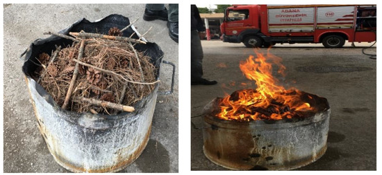 For this research, three experimental setups were prepared and classified as Exp.W, Exp.SB, and Exp.LB. For the fire suppression operations, water was used in Exp.W, boron-based solid fire suppressant was used in Exp.SB, and boron-based liquid fire suppressant was used in Exp.LB. In all three experiments, the fire studies appeared to be similar to forest fires. For this, pinecones and branches were prepared in equal amounts and placed in the burning pan. Red pine, which is frequently found in the Mediterranean region, was used. Additionally, in this study, thermal imaging cameras (TIC) were used to detect the initial exacerbation of the generated fire pattern and to monitor the extinguishing effect and temperature progression of the fire extinguishers. All of the experiments were conducted with Çukurova University and Adana Metropolitan Municipality Department of Fire and Rescue officers.