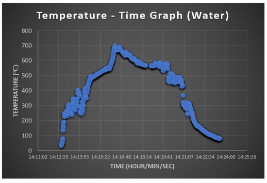 The extinguishing and cooling times of these three extinguishers were tested by using water, boron-based liquids, and solid fire suppressants. The weight of the burning brushwood in each trial was 15 kg. Totals of 50 L of water, 5 L of boron-based liquid suppressant, and 5 kg of boron-based solid suppressant were used in the experiments (Table 6, Figure 5 and Figure 6). In addition, a thermal camera system was used in all three trials, and thermal analysis was investigated for all three trials with a thermal camera. All trials were conducted outdoors and under the supervision of the firefighters. The fire start temperature was assumed to be ambient. The fire environment did not intervene until the temperature reached 700 °C. After reaching 700 °C, the fire extinguishing process started. The fire temperature was allowed to drop to 80 °C, and it was determined how long the extinguishers took to bring the fire under control and extinguish it.