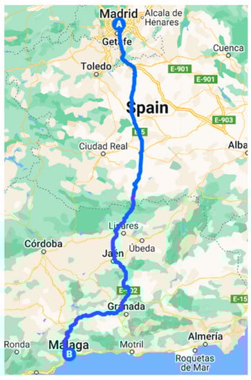 The case study analyzed in this manuscript concerns a stretch of highway connecting Madrid (A) to Malaga (B). Among the possible routes, the fastest one, with a total distance of 530 km (Figure 2) was selected. The route mainly consists of highway sections; the only urban areas refer to the city of Madrid and Malaga. However, considering that the maximum speed allowed on the highway is 120 [], a constant average speed of 100 is maintained in the simulation. Under this assumption, with no stops and no travel breaks, the time required to travel the distance is about 5½ h [].