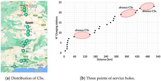 Based on the aforementioned assumptions, the analysis, carried out through the Google Maps application, reveals the presence of 23 public CSs along the route from Madrid to Malaga []. Among these CSs, four stations are Tesla superchargers, boasting a power rating of 150 kW. Their precise locations along the highway are depicted in Figure 3. However, it is worth noting that the distribution of CSs is not uniform, with a concentration in specific urban areas. A closer examination of the distances between CSs reveals that only a span of 100 km is covered by the existing CSs. In contrast, the remaining sections of the highway, encompassing three prominent stretches (identified by red circles in Figure 3), comprise nearly 47.2% of the entire highway distance, amounting to approximately 250 km of service gap. These stretches represent significant areas lacking CS infrastructure, posing a challenge for EV drivers seeking to charge opportunities along these segments.