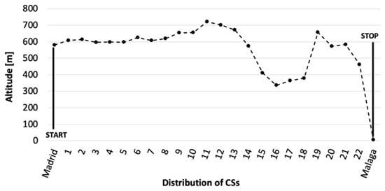 The impact of road slopes on electricity consumption is widely recognized as one of the critical factors affecting EVs [,]. Therefore, the proposed model thoroughly examines road slope as a topological parameter to assess its impact on selected path characteristics. The route is divided into 23 distinct sections to facilitate this analysis, with the extreme stations denoted as extreme stations CS2-CS1. For each of these sections, 23 elevation values are defined, as depicted in Figure 4. This comprehensive division enables a detailed evaluation of the varying road slopes along the route, aiding in the accurate estimation of electricity consumption and providing valuable insights into optimizing EV performance as well. The generated profile exhibits an average slope of −0.3%, with the most pronounced gradient recorded as −3.3% during the final segment before reaching the city of Malaga. Given the approximate −600 m difference in altitude between the Madrid and Malaga terminals, the battery consumption is relatively lower compared to a flat-ride scenario. By calculating the total energy consumption saved during the journey, amounting to −3.3 kWh, it can be inferred that approximately 22 km of the range is preserved to complete the trip []. This indicates the significant impact of varying slopes on energy efficiency, resulting in an extended driving range for the EV.