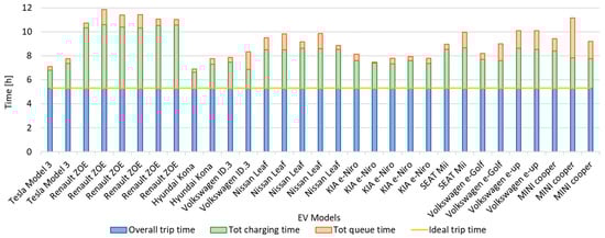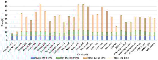 Figure 5 illustrates the trip characteristics for each EV, presenting the overall trip time (depicted in blue), time spent in queues (indicated in red), and charging time (represented in green). It is observed that variations in travel times primarily stem from queue wait times rather than charging durations, which remain relatively consistent across different EV models. Thus, this highlights the significance of queue management strategies in minimizing the overall trip duration and optimizing the EV charging experience. The Tesla models are an exception because they can use supercharger stations accessible only to them and, therefore, they are rarely subject to queues and are of higher power than other CSs.