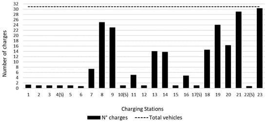 Figure 6 presents the distribution of the number of recharges conducted at each charging station. The dashed line represents the maximum number of charges, which is 31, equivalent to the total number of simulated EVs. Notably, the presence of the “S” marker signifies supercharge stations that are exclusively compatible with Tesla vehicles. The analysis reveals that the CSs experiencing the highest stress level are positioned at the terminus of lengthy freeway sections devoid of charging infrastructure. As a consequence, a significant number of EVs are compelled to recharge at these locations, resulting in bottleneck scenarios. This observation highlights the critical need to address the inadequacies of charging infrastructure along these extended freeway segments, as it substantially impacts the overall efficiency and flow of EV travel.