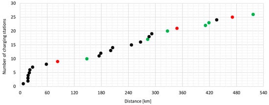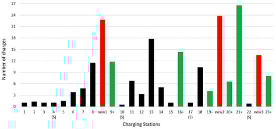 Following the optimization process, additional CSs are strategically added in areas lacking service, allowing EVs to choose from multiple stations based on their range capabilities rather than being restricted to a specific station. Consequently, the total charges in the simulation are now dispersed more evenly among more CSs, promoting a more balanced utilization of charging infrastructure. Notably, the last CS (CS No 23) exhibits the least utilization, with charges distributed between this CS and the preceding one, which is added during the optimization phase, as depicted in Figure 9. The newly implemented CSs are highlighted in red, the enhanced CSs in green, and the unchanged CSs in black, visually illustrating the modifications made to the CS network during the optimization process.