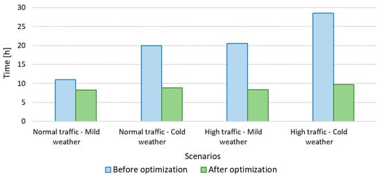 Lastly, the average travel times observed in all four scenarios, both before and after optimization, are documented. Notably, a significant time reduction of approximately two hours is achieved in the optimal scenario characterized by Normal Traffic–Mild Weather. Conversely, in the most unfavorable scenario, spanning the worst-case scenario with adverse conditions, the time saved amounts to an impressive nineteen hours. Figure 10 visually represents these findings, further highlighting the substantial improvements resulting from the optimization process.