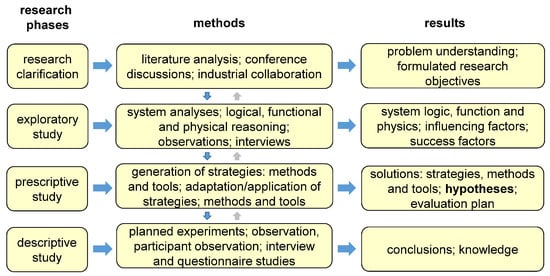 The primary objective of the article is to provide a comprehensive understanding of resilient design through the application of PSSs with AGVs as a foundational framework. The research endeavour is embedded in the design research methodology (DRM) proposed by Blessing and Chakrabarti [], which distinguishes four stages of research. The four main research phases are described together with appropriate methods and results in Figure 2.
