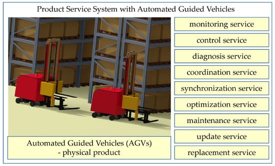 A prominent application of AGVs is the transport of items within a production or storage system. Essentially, the customers of an AGV want a transportation task to be carried out. Therefore, a combination of the product AGV with certain services, such as control services or maintenance services, may be advantageous, both for the producer of an AGV and the operator of a production or storage system. A key advantage of this kind of combination can be a concentration of knowledge and experience. Such combinations can be referred to as product service systems (PSSs) and have been studied for several years. An early definition of PSSs was already given in 1999 by Goedkoop et al.: a product is a tangible entity manufactured to be sold; a service is an activity carried out for others; a system is a collection of elements and their relations; consequently, a product service system (PSS) can be defined as a marketable set of product(s) and service(s) capable of jointly fulfilling the need(s) of user(s) (see []). Current research is focused on the validation of PSSs [] and on exploring value proposition design approaches []. PSSs with AGVs combine the tangible product AGV with services which allow, support or prolong the operation of the AGV or a fleet of AGVs. The operator of a production or storage facility essentially receives the solution to a transportation problem. The necessary and optional services can range from simple control tasks over path planning and coordination/synchronization to maintenance, or even system update and replacement. Figure 3 shows the main elements of a PSS with AGVs, with the physical products on the left side and the services on the right side.