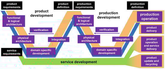Two main sections of this PSSs with AGVs life-cycle model are based on the well-known V-model, which was, amongst others, proposed in the VDI (Verein Deutscher Ingenieure - The Association of German Engineers) guideline 2206 [,] for the development of cyber-physical systems. It is important to note that, both in product development and in production development, iterative cycles are possible; this is indicated by the verification arrow pointing to the left side. In this model, the product development cycle is shown before the production development cycle. It is important to note that the model is intended to be understood as a logical model and that both cycles can and should be carried out simultaneously. It is also important to note that the main focus of this model is on the early stages and that the system operation stage is only represented in one field—this stage may have the longest duration and can require the largest resources, but is already covered by resilience engineering and resilient control.