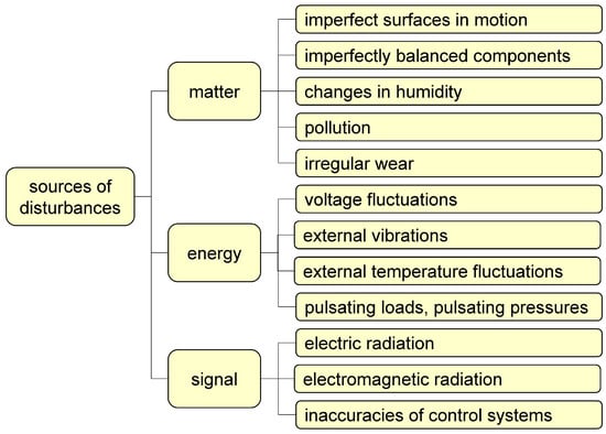 During the manufacturing and operation of technical systems, disturbances, such as vibrations, cannot be avoided, because certain influences, such as imbalances or electrical fluctuations, cannot be completely prevented. These disturbances cause differences between the actual operation and quality of technical systems and their theoretical operation and quality (see []). In general, a distinction between different kinds of causes of disturbances should be made in systems development [] (in the operation stage, certain strategies, such as the employment of a back-up system, may require no distinction between these kinds of causes). One possible distinction is a distinction between matter, energy and signal, as is also proposed for the functional domain in systematic design science []. A typical example for a disturbance caused by matter is an imperfect surface which will lead to vibration when relative motion is necessary. An example of a disturbance caused by energy is fluctuation in the voltage of a power supply. A sensor communication line subjected to electric radiation is an example for a disturbance caused by a signal. Figure 5 summarizes common sources of disturbances.